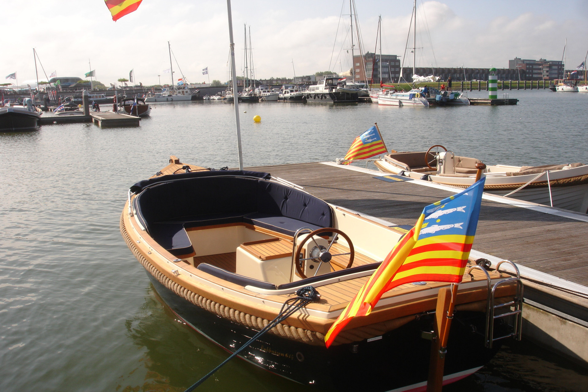 Afleveringskosten incl. halve tank diesel, 2 fenders, 2 landvasten, vlag, vlaggestokhouder, naam op boot aangebracht € 625,=
